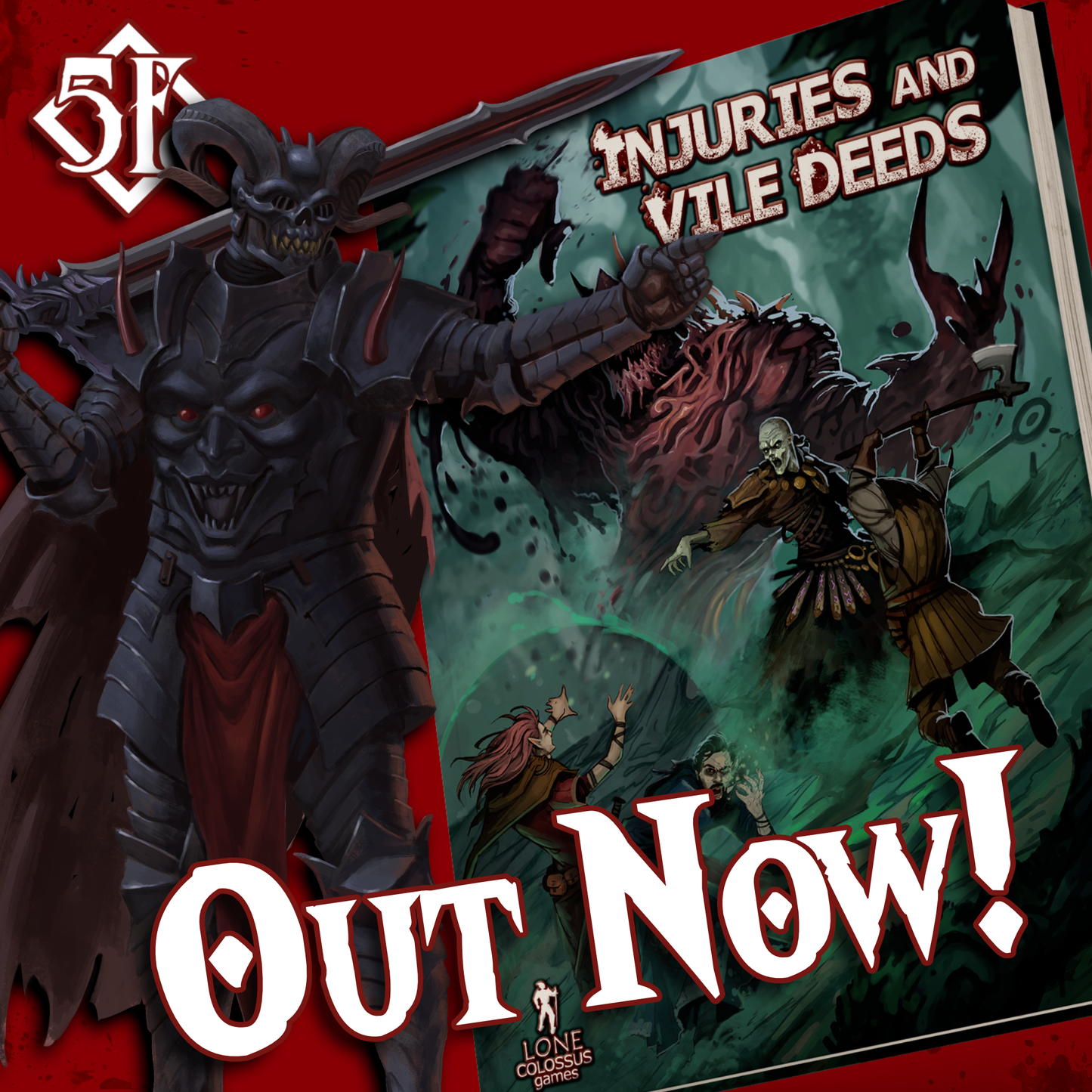 Injuries & Vile Deeds contains Injury systems for PCs and their enemies, adding rules to encourage tactical and descriptive combat for Dungeons & Dragons 5th edition. It also comes packed with 220 pages of new feats, items, spells, subclasses, terrifying monsters, and villainous NPCs to use at your table.